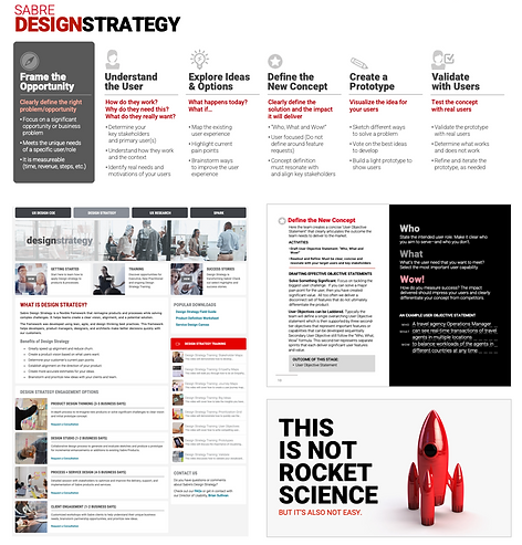 In order to formalize the UX team’s participation in early stage product planning and design, I worked with our team to build and launch our own Sabre Design Strategy framework. This effort, based on IDEO and IBM Design Thinking methods, was customized for the unique aspects of the Sabre culture, range of products and work processes.